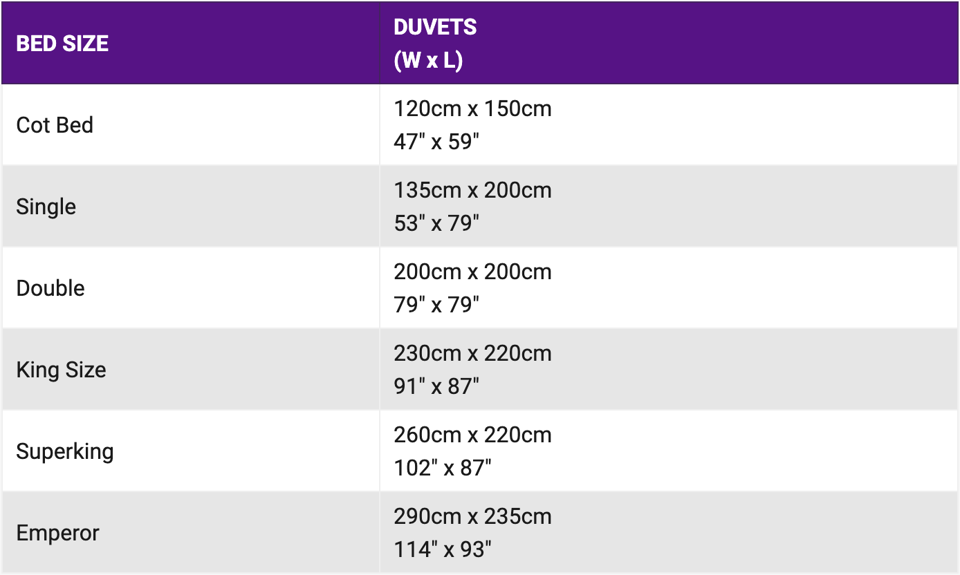 We have six different duvet sizes available in our range. Starting with the smallest, we have cot-bed size duvets which are 120cm x 150cm. Remember, these are for young children sleeping in a cot bed and must NEVER be used on a baby under one year old.