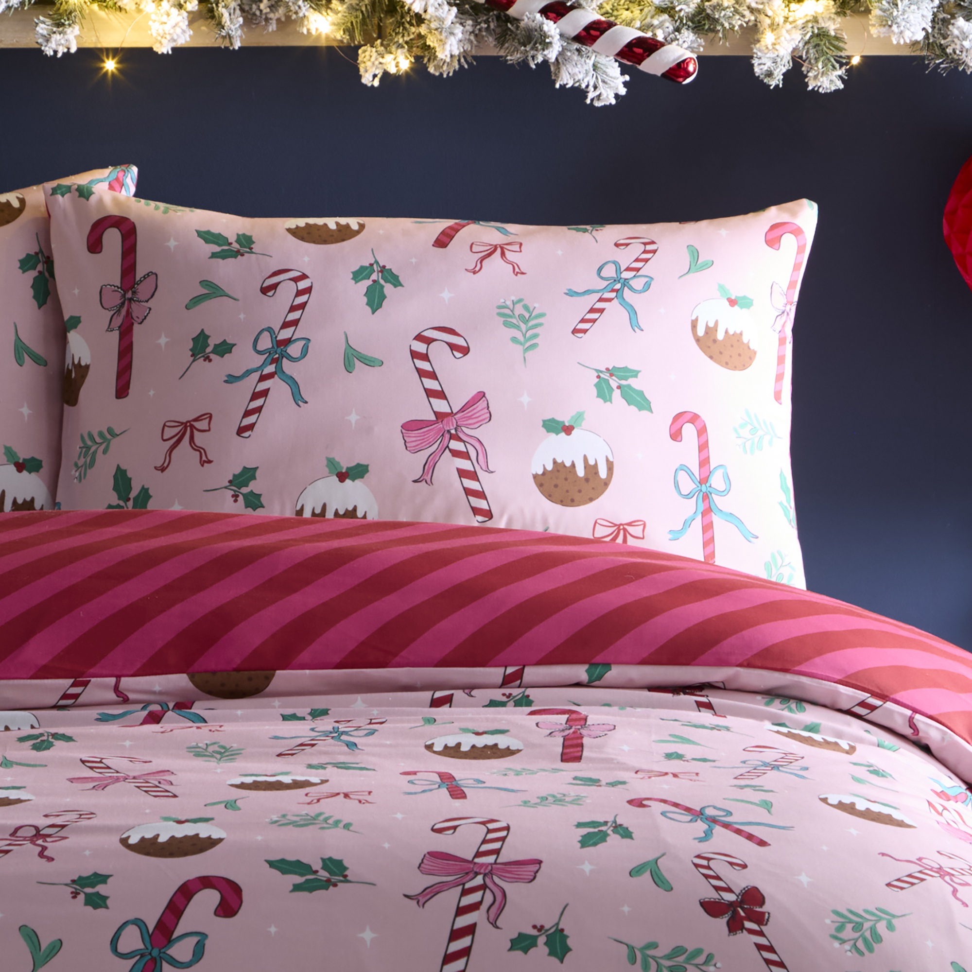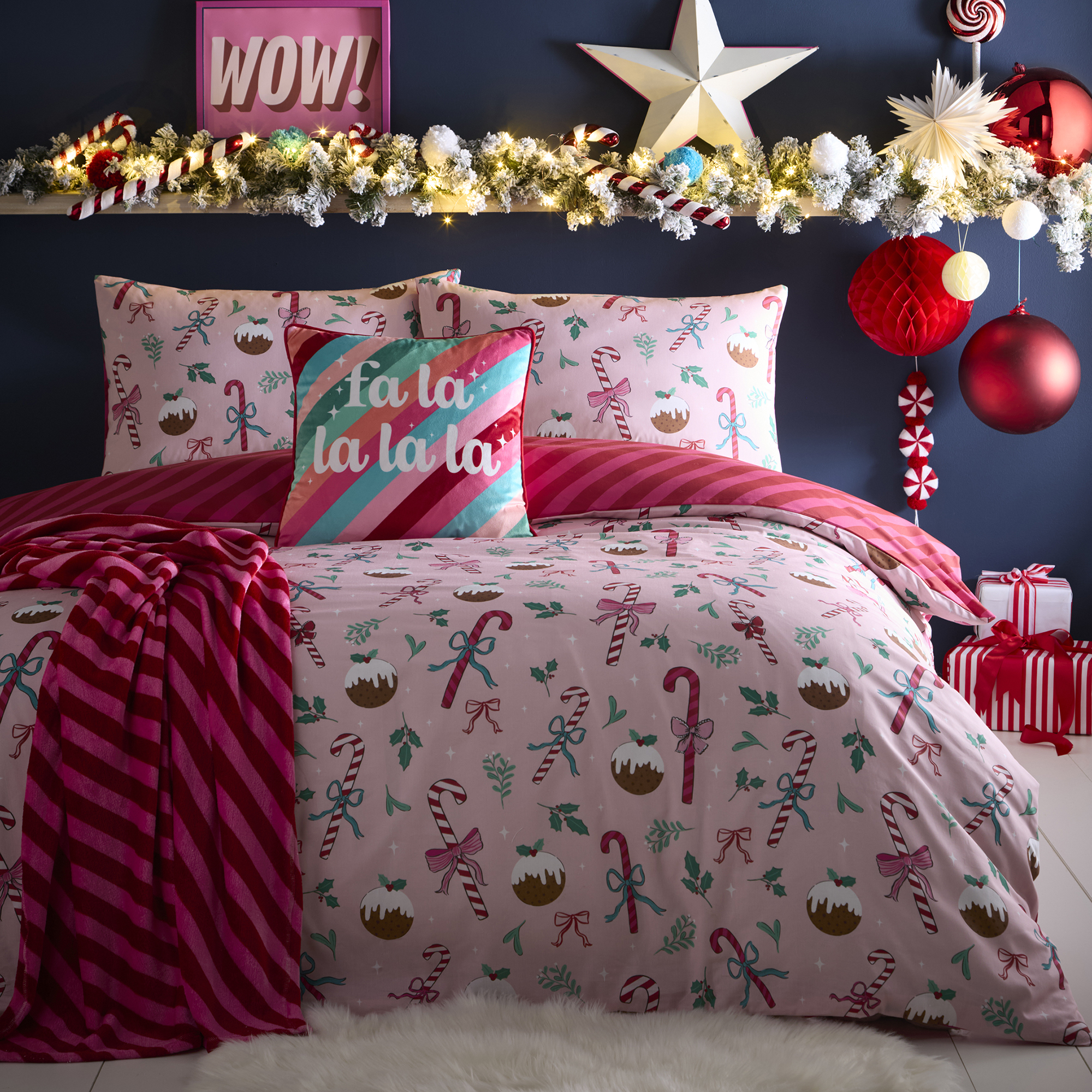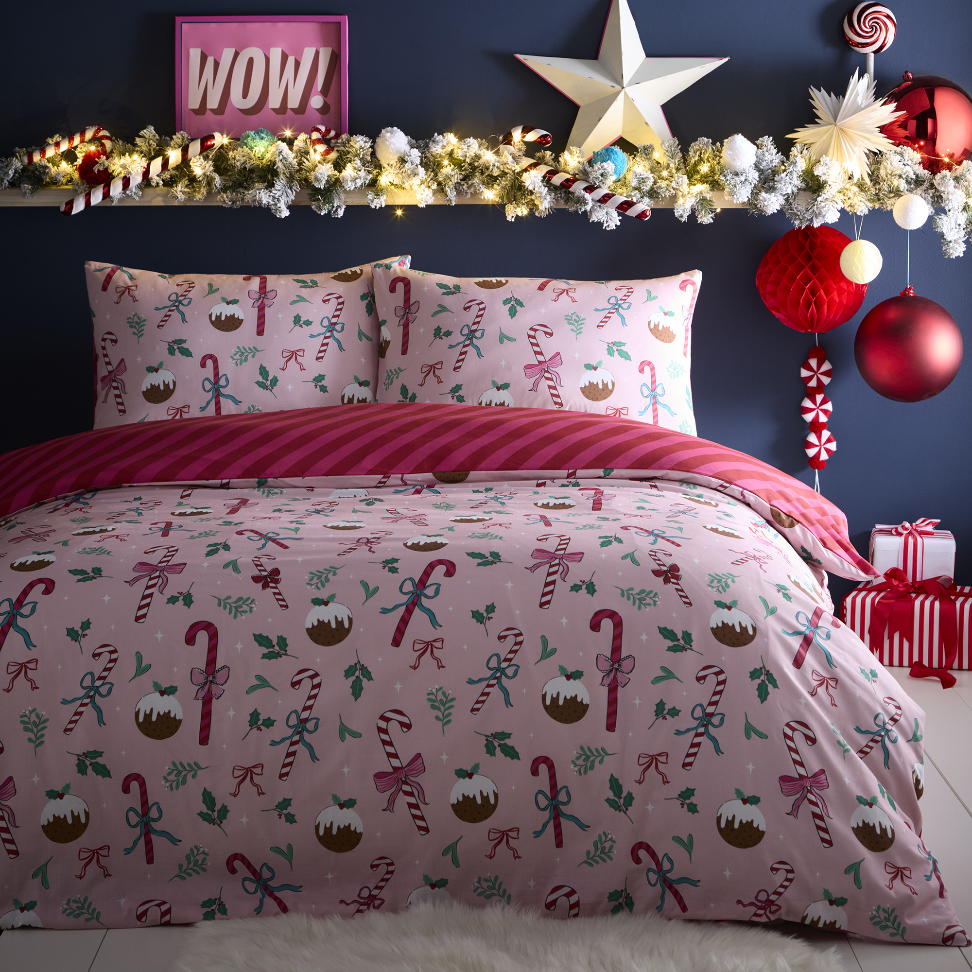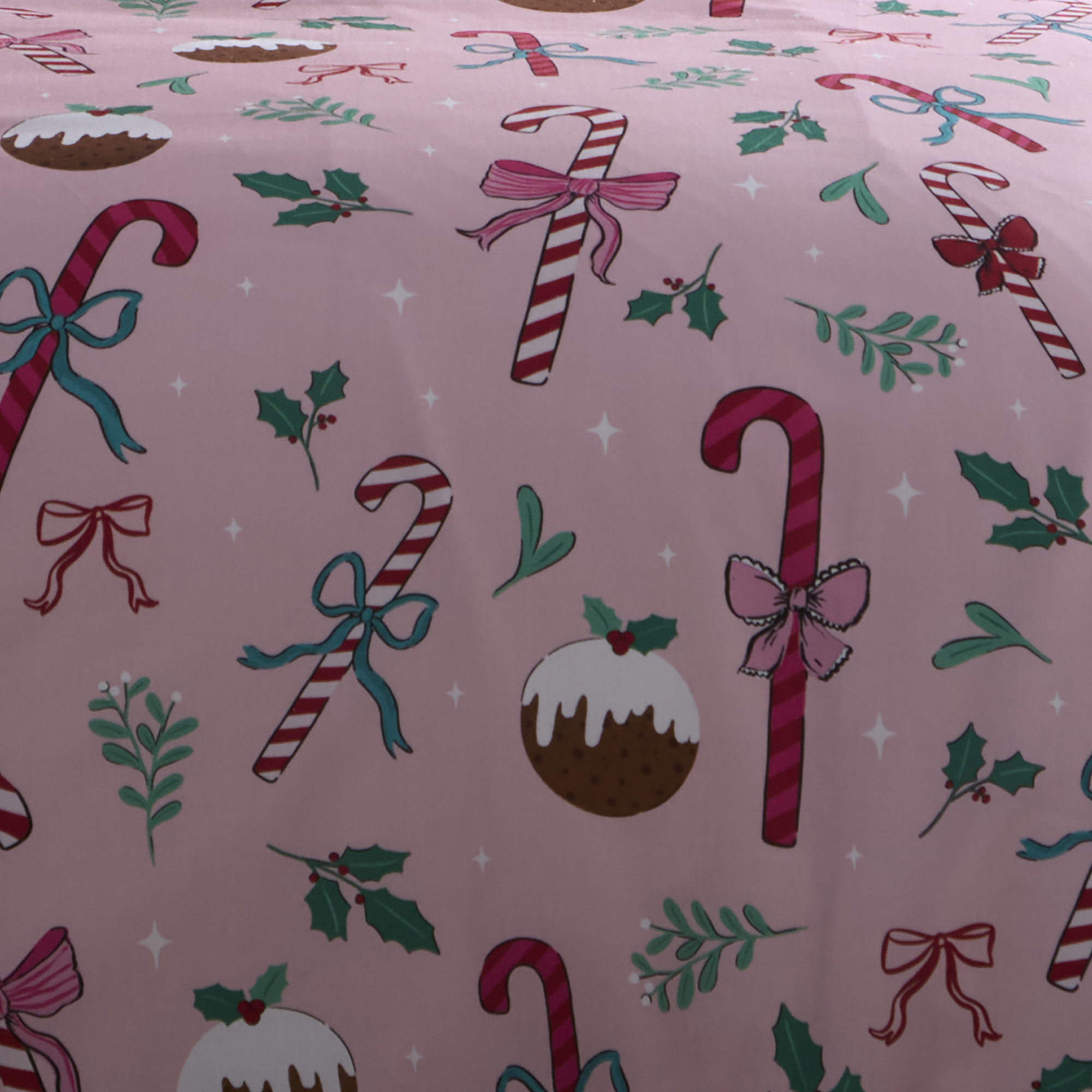 Bring a burst of festive joy to your bedroom with the Fusion™ Christmas Festive Fancy Duvet Cover Set — where playful charm meets modern style. Featuring a delightful mix of candy canes, Christmas puddings, and mistletoe scattered across a vibrant pink background, this bedding set adds a fun, fashion-forward twist to traditional holiday décor.