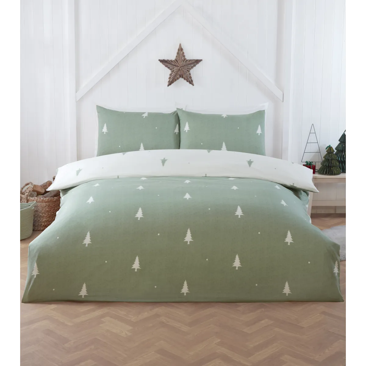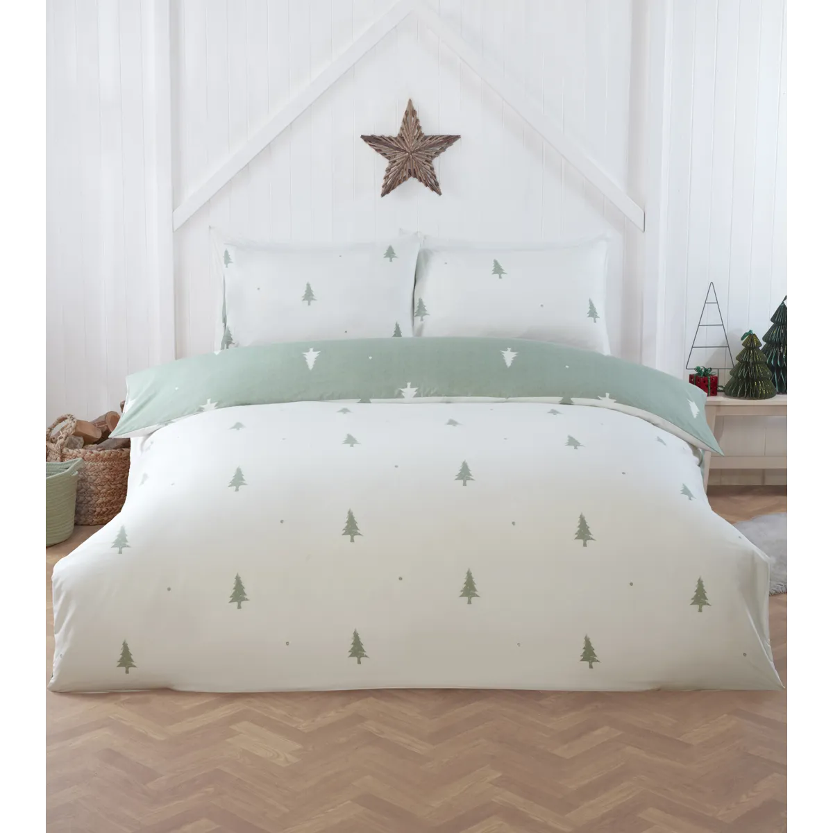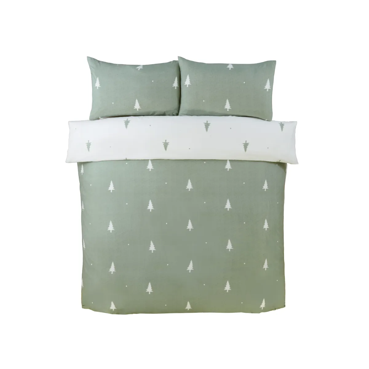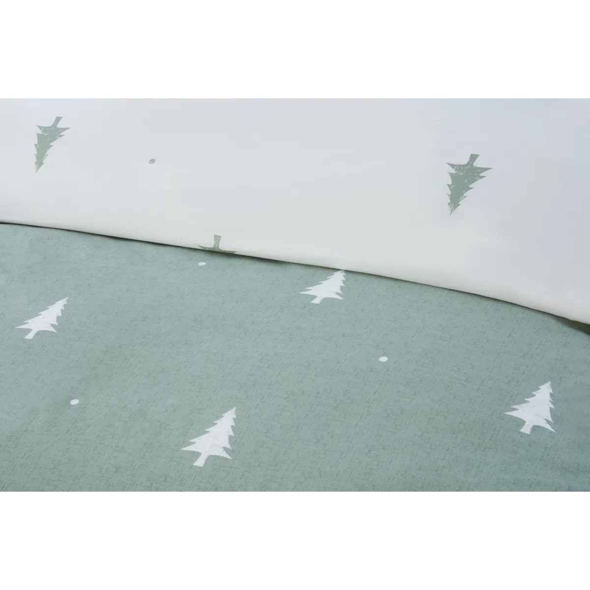Adorned with a playful scattering of white fir trees and delicate snow-like dots on a calming sage green background, this bedding exudes a peaceful, nature-inspired charm.